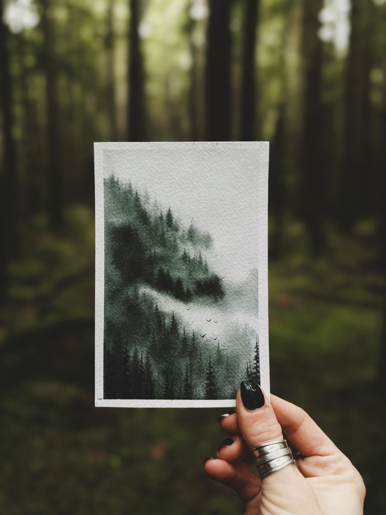 Bring the quiet magic of the forest into your home with this one-of-a-kind original watercolor painting, inspired by the misty evergreen mountains of the Pacific Northwest. Soft, atmospheric layers of fading treelines create a sense of calm and depth, while distant birds drift through the fog — a moment of wilderness captured in brush and water.