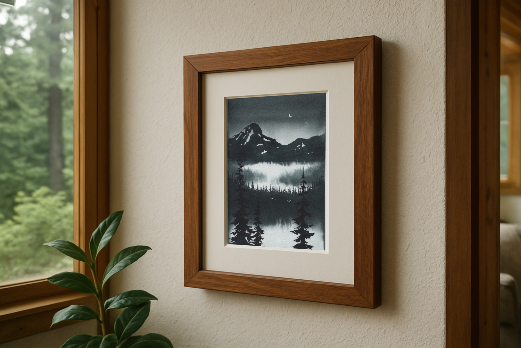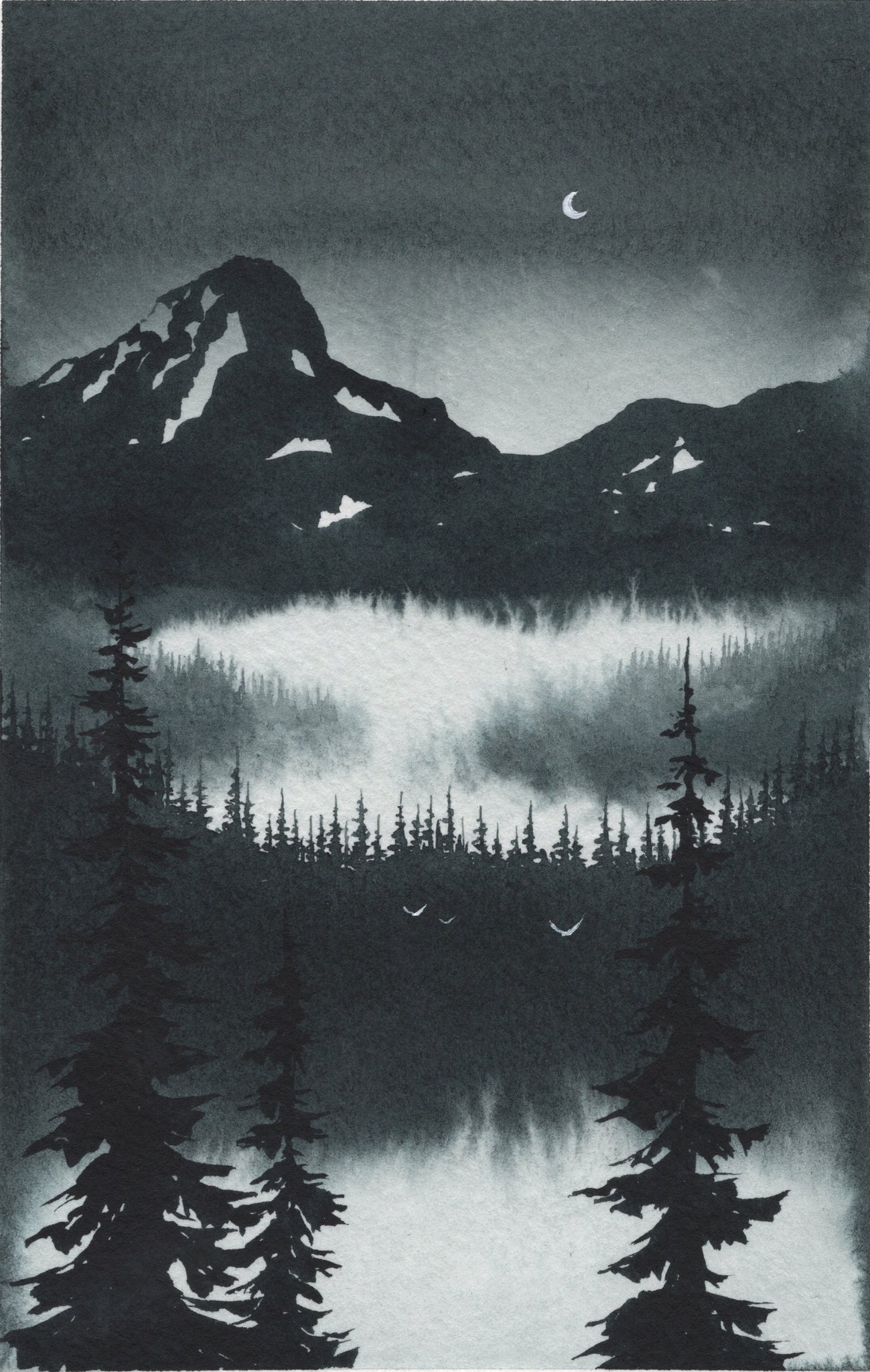 “Nightfall” captures the calm shift as the last light fades and the mountains settle into deep blue shadow. A thin crescent moon hangs above the ridge while mist pools quietly in the valley, softening the line between forest and sky. This piece reflects that peaceful pause before true darkness arrives — when everything feels hushed, still, and a little bit magical.
